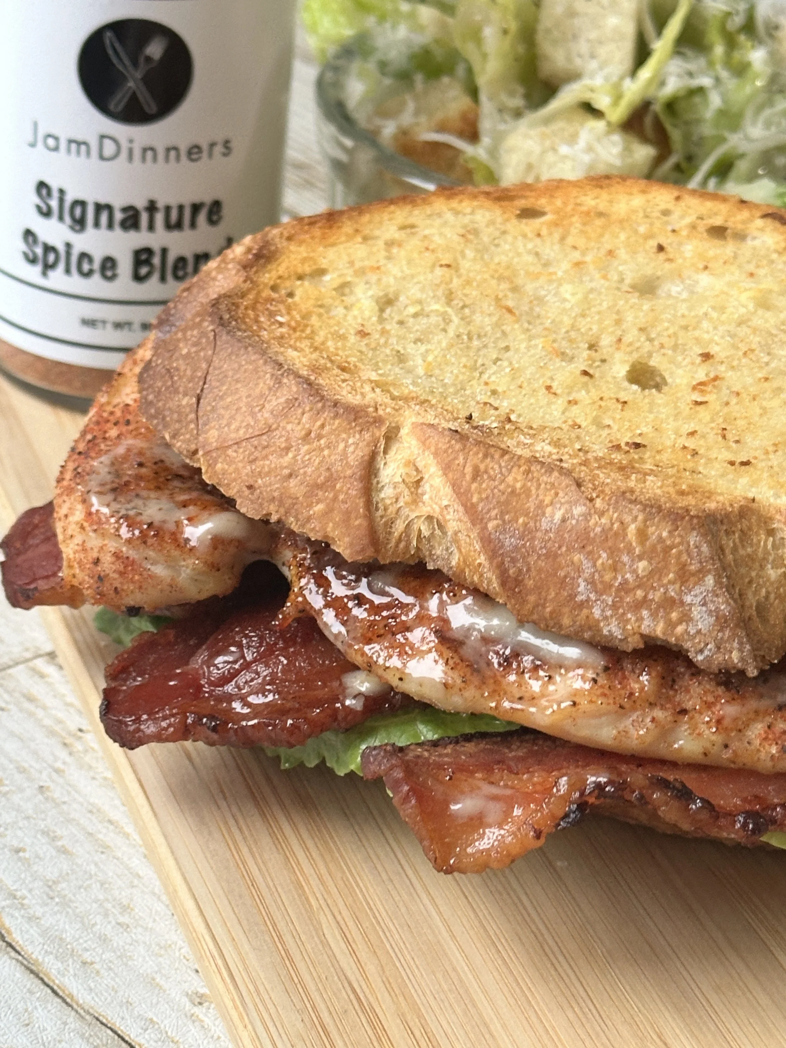 Lay a slice of garlic toast down, top with the chicken breast then brush the chicken with caesar dressing, lay a piece of lettuce on top and brush that with caesar dressing as well. Lay 2-3 half slices of bacon on top and then add the 2nd garlic toast. Serve with a caesar salad … obviously. Add some shaved parmesan cheese where possible too.