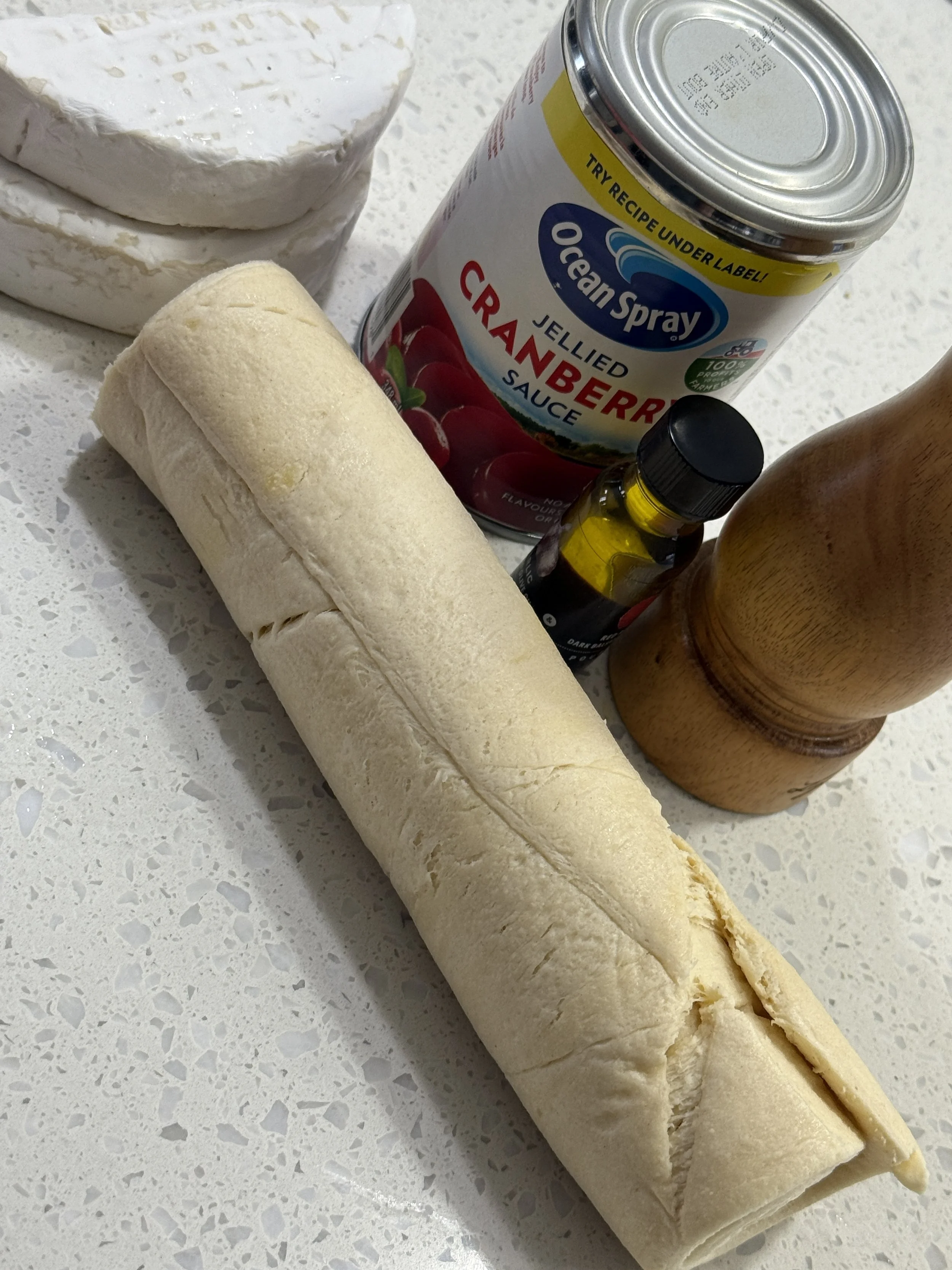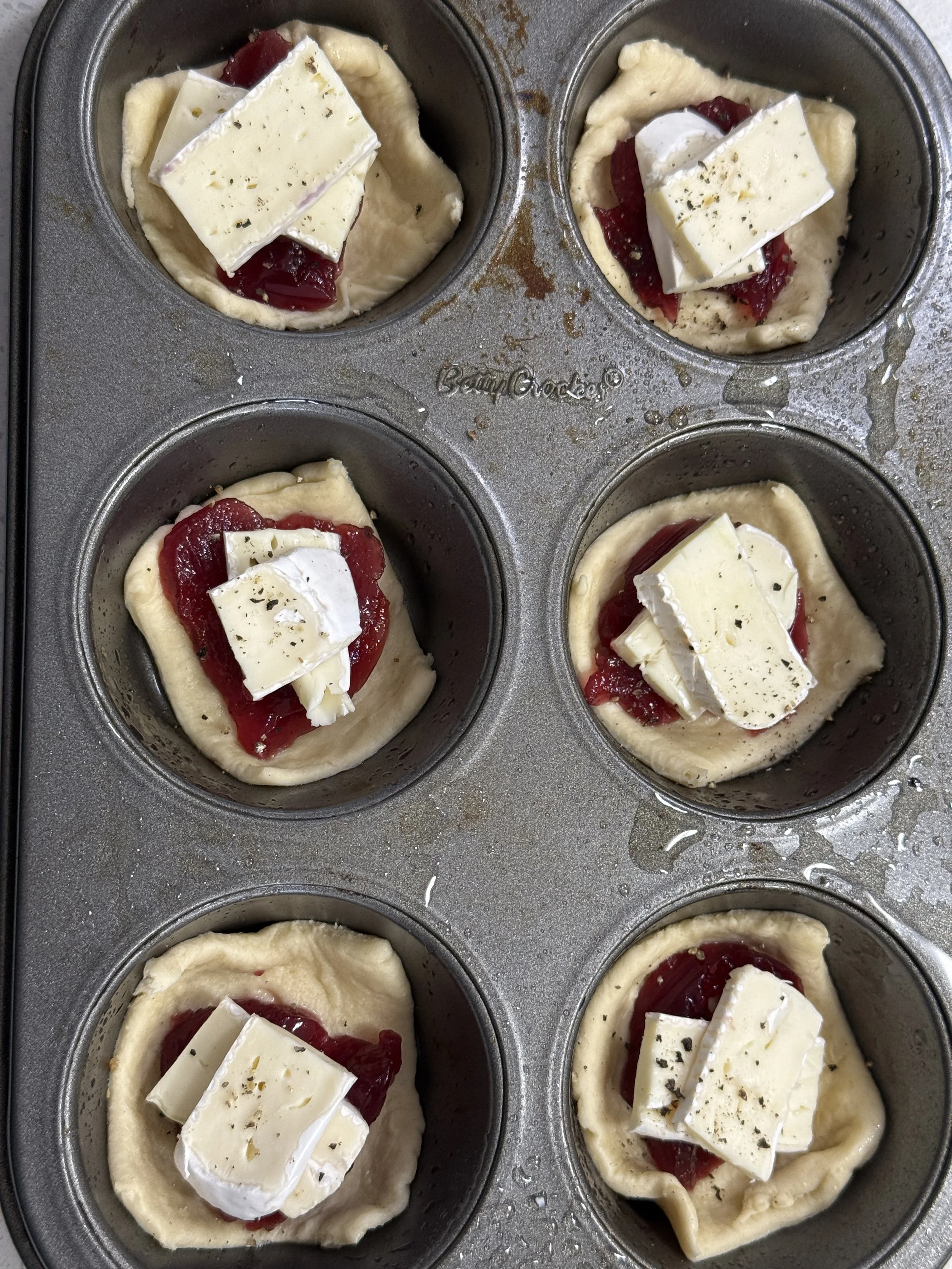 Place the bite sized pieces of brie inside each dough square. Top with a spoonful of cranberry sauce (mix the cranberry sauce with the balsamic vinegar before hand if you choose to add it).
