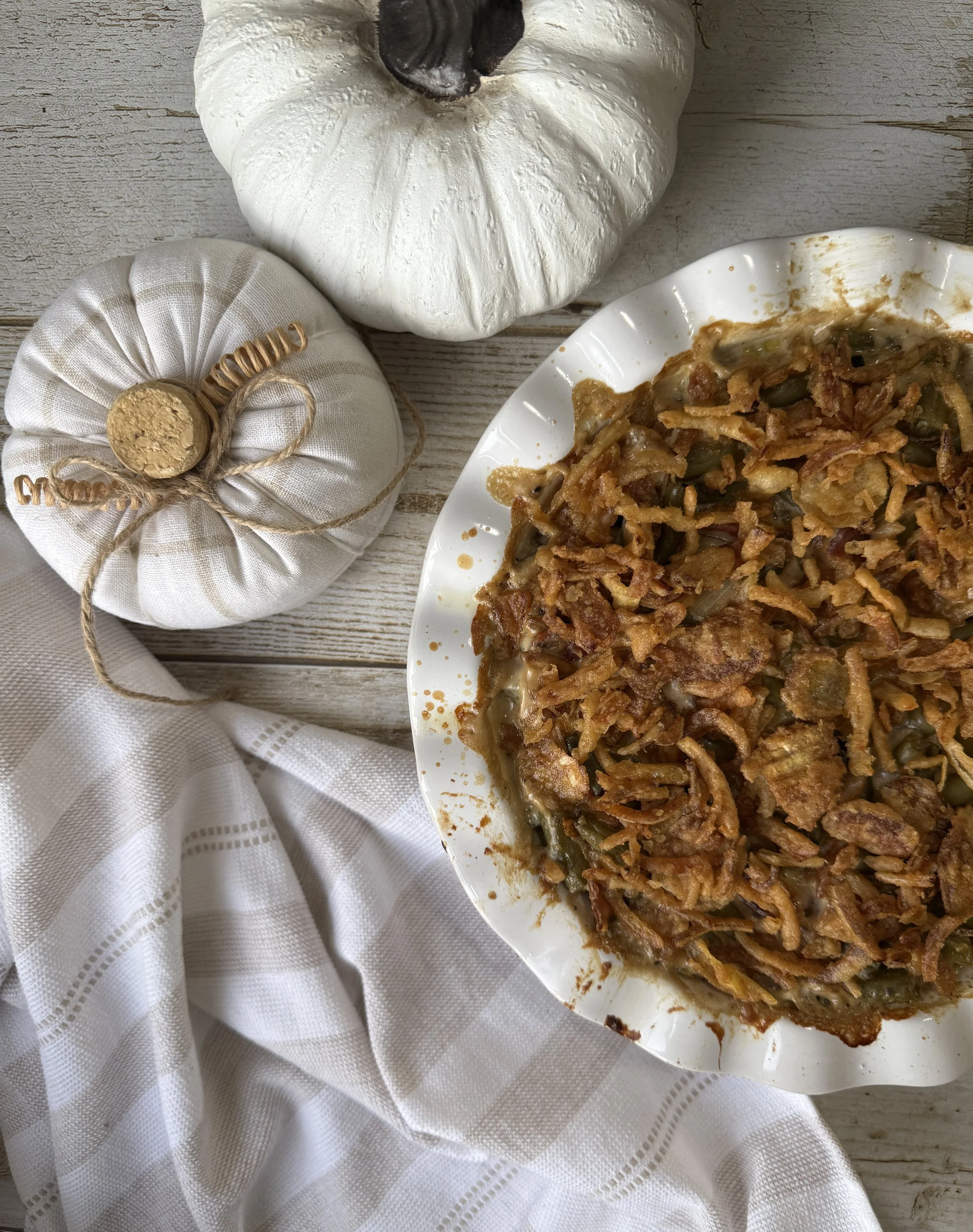 Green Bean Casserole is one of the easiest side dishes you can make for a large family dinner and it is usually a crowd favorite! You can make a super basic Green Bean Casserole with 3-4 ingredients or you can do what I do and put your own spin on it and go EXTRA to really make it the BEST GB casserole around. I like to add fresh sliced mushrooms and even sometimes bacon and or extra cheese. I also go a little extra on the crispy onion sometimes because they are fun!