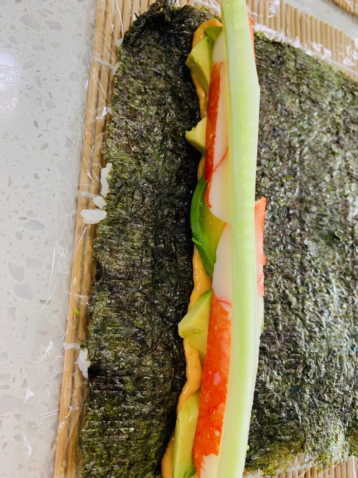 Now is the time to put together your roll. Start by spreading a small layer of sriracha mayo from one end of the seaweed to the other (make sure to start laying the toppings about 1 inch from the left side of the seaweed. Next up is the crab meat, spread a layer or lay down enough pieces to cover the line of sriracha mayo. Add a thin layer of avocado next and then 1 long piece of cucumber.