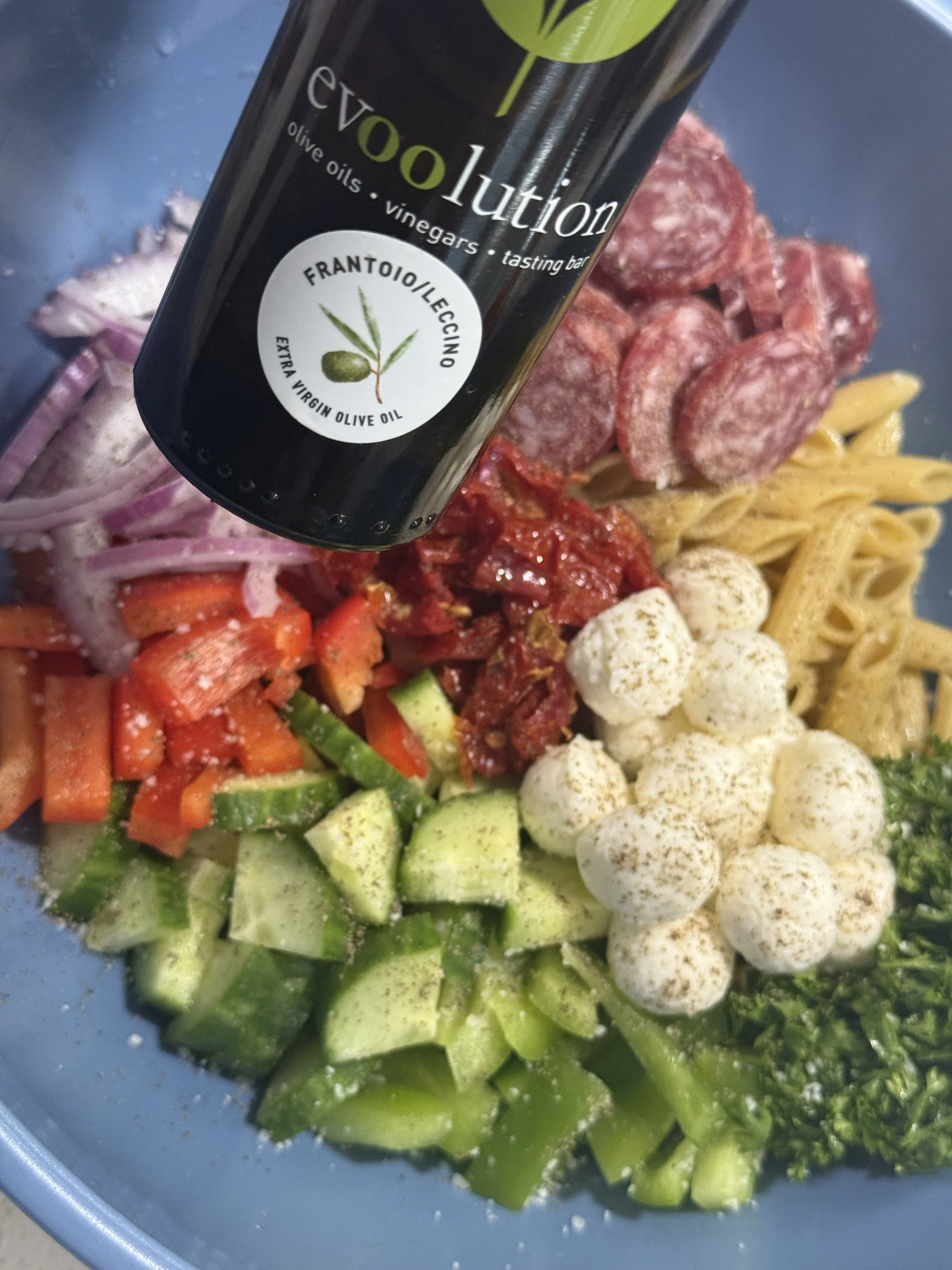 There are so many ways to mix up your ‘pasta’ routine. It does not always have to be noodles and sauce and noodles and sauce. This Italian Pasta Salad is refreshing and a great way to use up some of the random vegetables you have around the house before they go bad. It is also a great excuse to indulge in some great quality cheese and salami. You can use any oil dressing you wish (a Greek dressing would actually be good too or Italian dressing, but we like to keep it simple with oil, salt & pepper).