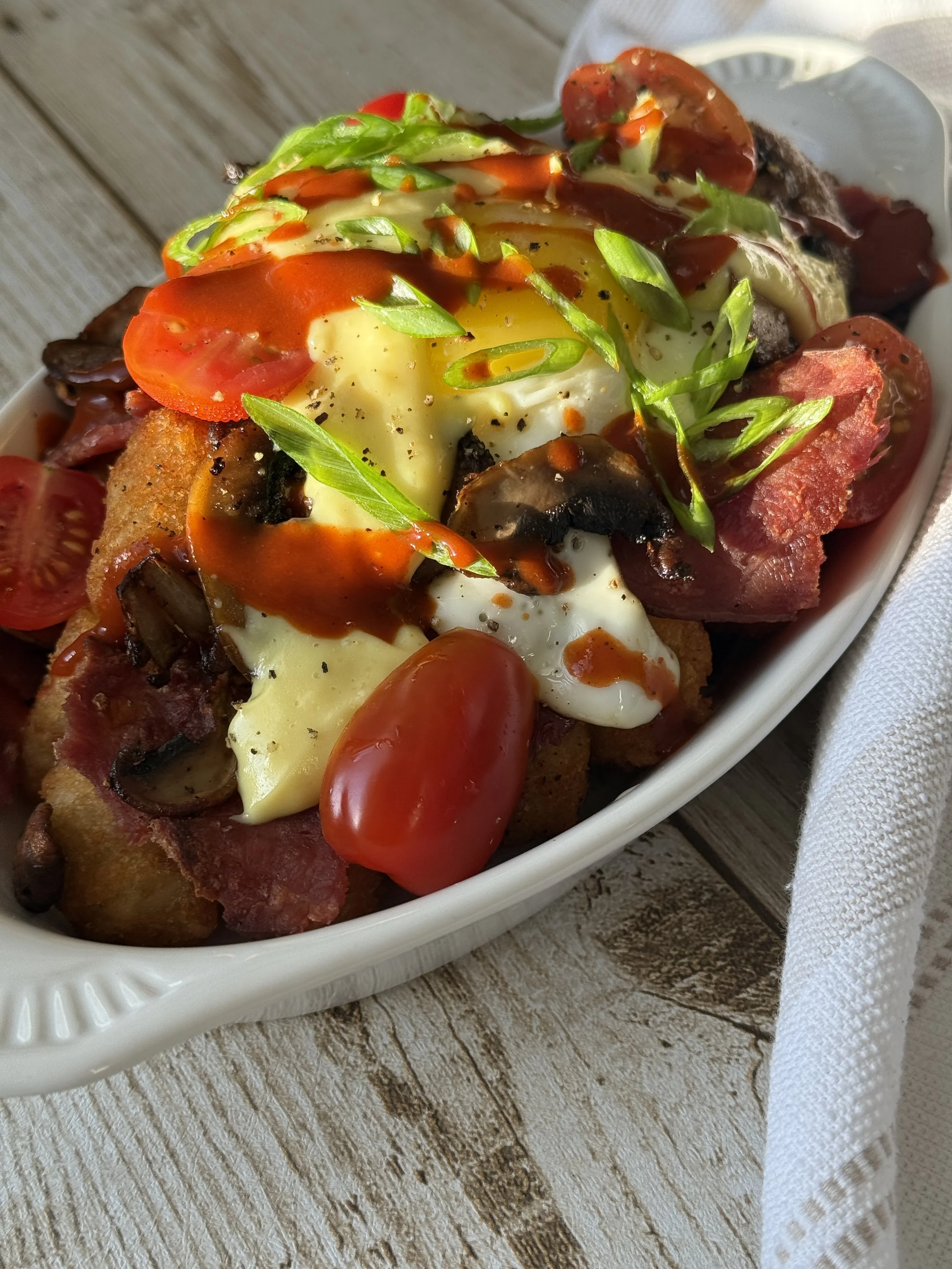 Cook eggs in a heated frying pan, sunny side up. While the eggs are cooking fill 2 bowls with equal portions of the tater tots first then cooked bacon and vegetables. Place 1 egg on top of each then sprinkle with cheese and top with hollandaise sauce. You can literally substitute your meats for sausage, ham or bacon and you can substitute the tater tots for hashbrowns or wedges. Enjoy!