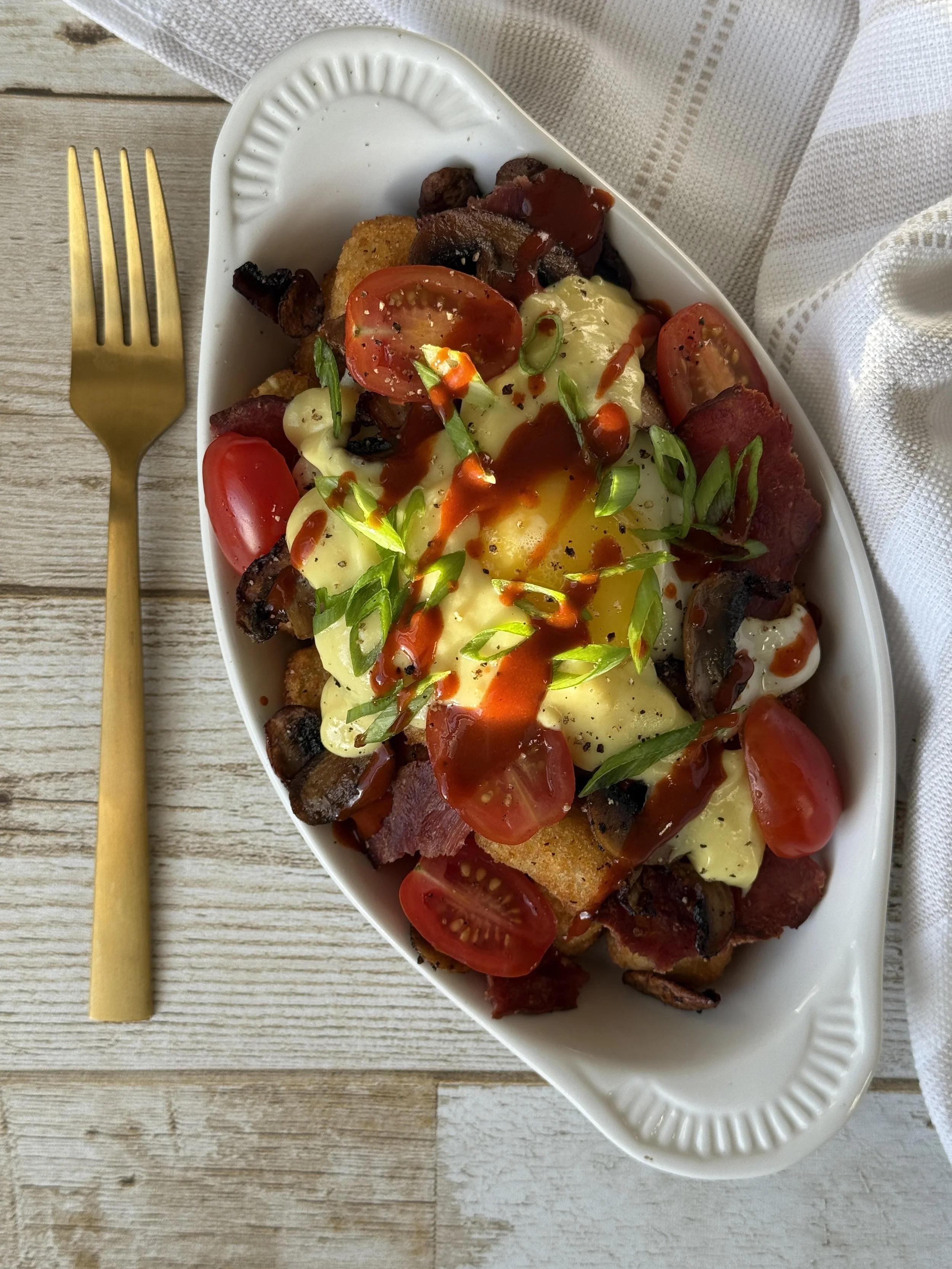 Although I can whip together a delicious batch of pancakes or yummy yogurt cups, I am a salt fanatic and prefer savory breakfasts versus sweet ones. There are endless possibilities with this Breakfast Poutine and you can personalize it however you wish! It does take a little time as some of it is done in stages but it is fairly simple when it all comes together.