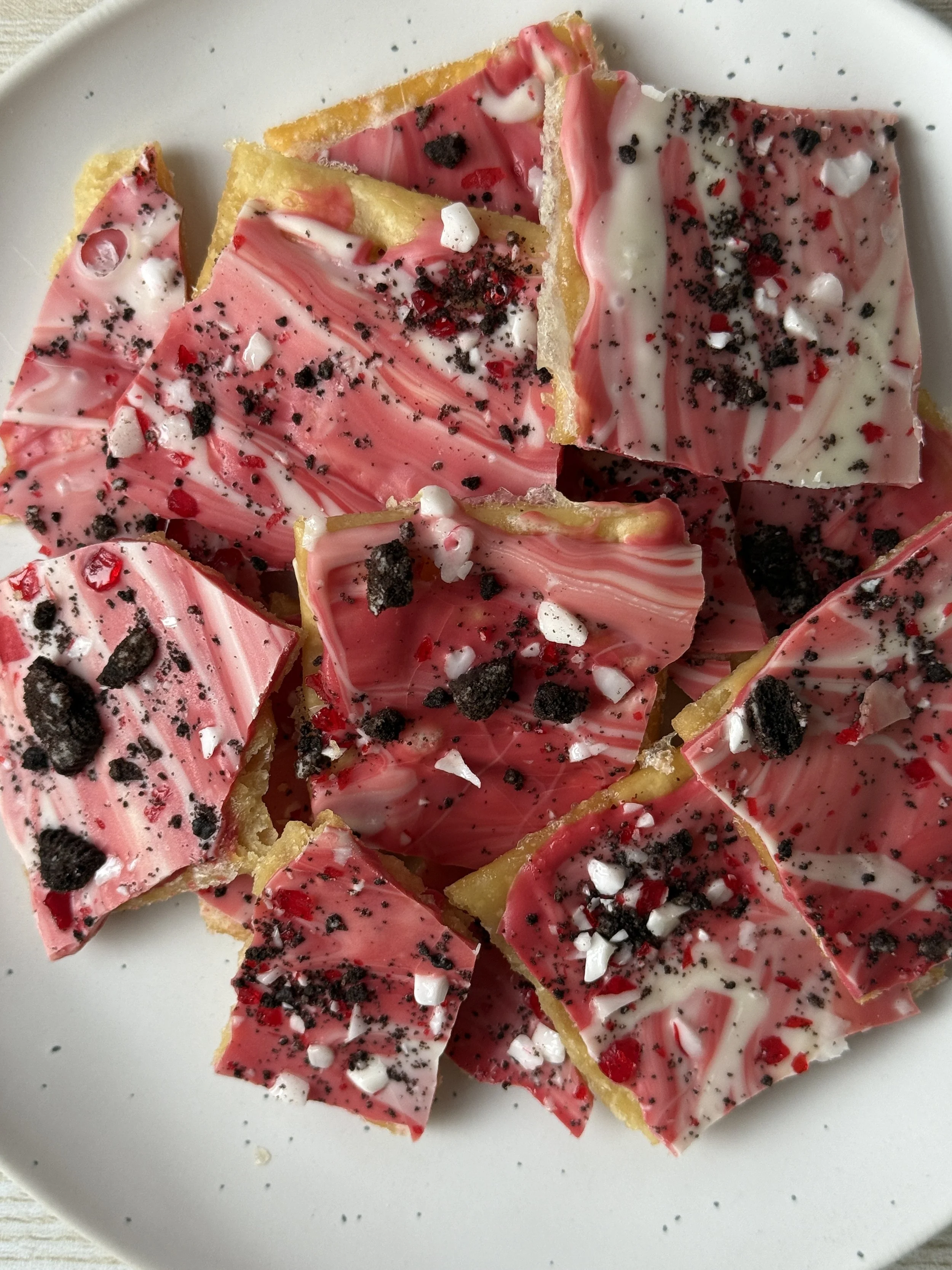 Drizzle the melted white chocolate evenly over the crackers and then add random spots of green or red if desired. Mix in together. Add sprinkles or crushed candy cane or crushed oreo and then freeze for a minimum 2 hours.