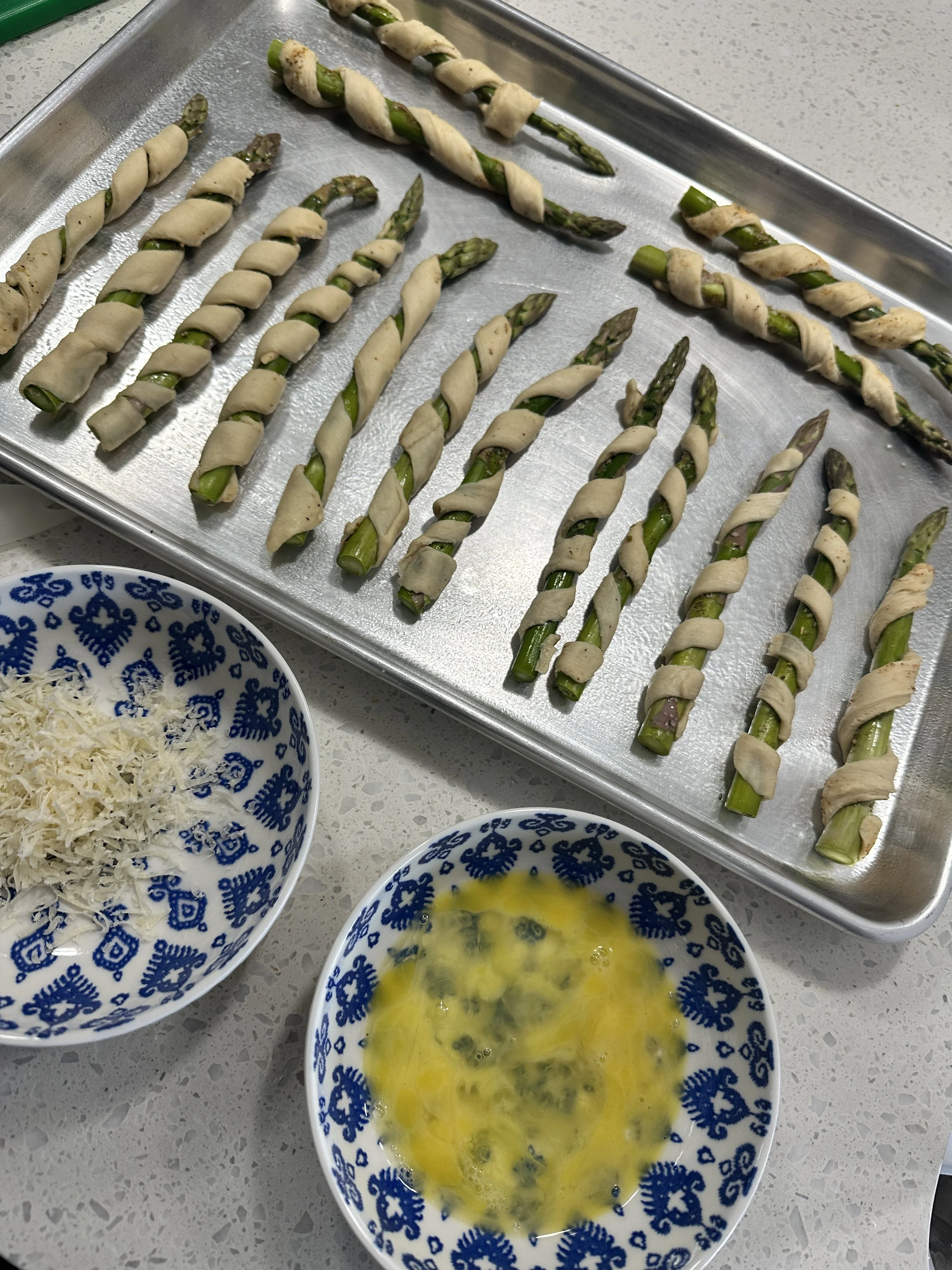 Place them on a baking sheet and repeat until you are done. Crack the egg into a bowl and beat it to make an egg wash. Brush each asparagus twist with the egg wash (the pastry parts) and sprinkle with Parmesan cheese.