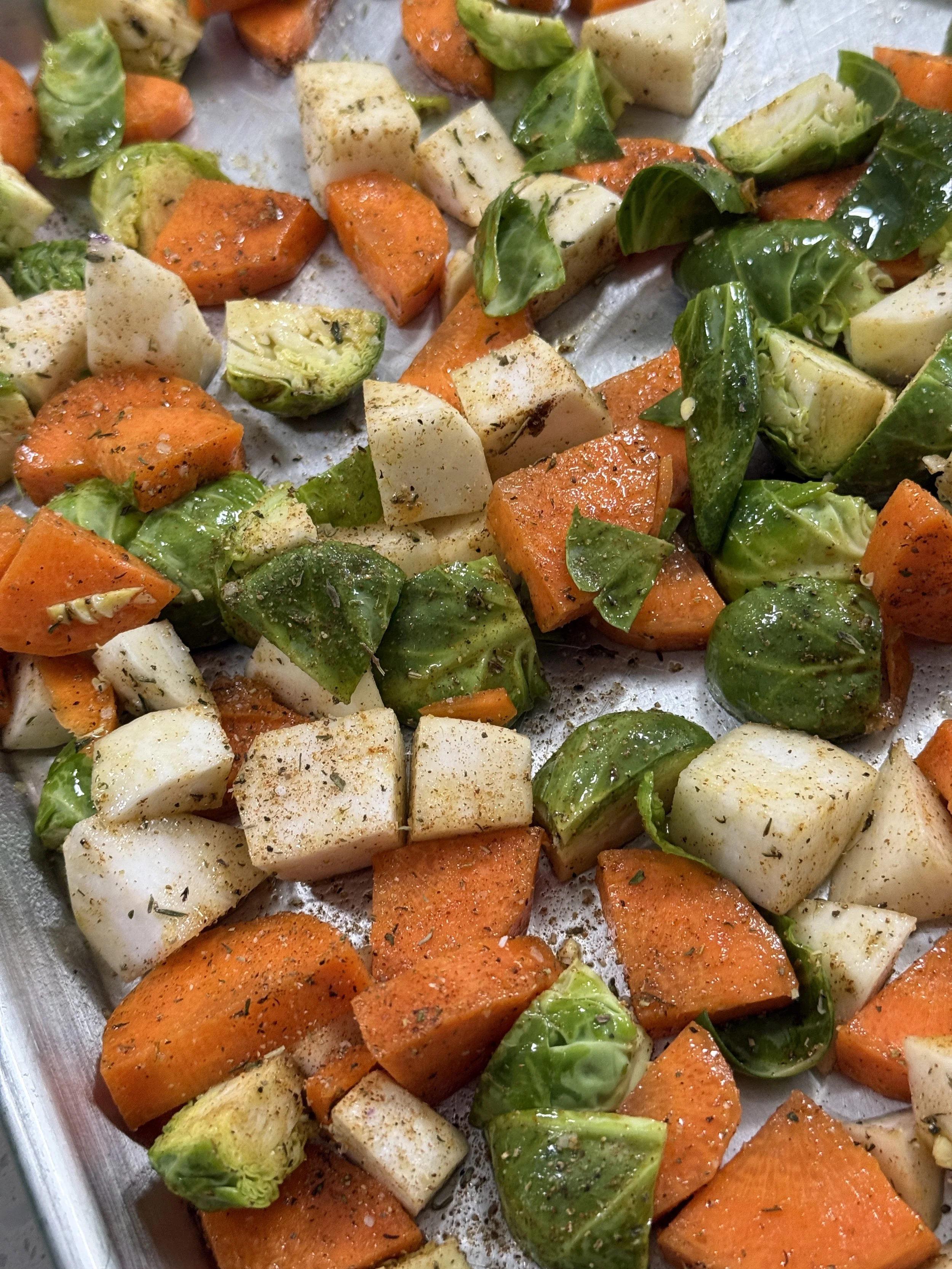 In a small bowl, combine the olive oil with the chopped veggies and the turkey dry rub. I will sometimes split the veggies out and cook the carrots + brussles + turnips first because they take longer.