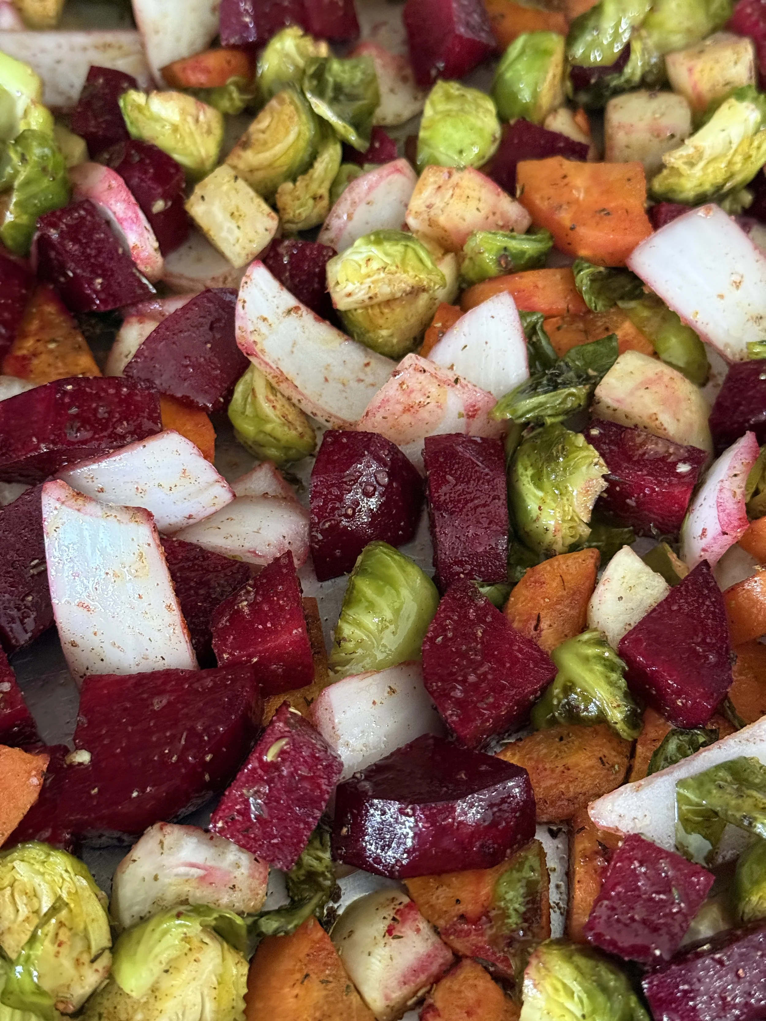 Growing up I never thought I would be caught DEAD eating a roasted root vegetable dish. Turnips? Gross. Beets … even worse! That is what I thought anyways but now as I near 31 I could not enjoy these vegetables anymore! They are so delicious. They are a perfect/easy side dish for any Thanksgiving dinner too! I would like to give a special shout out to Wendy (my recipe mentor!) for sharing the basis of her root vegetable recipe for me to play around with! She is the queen of cooking/baking and I thank her for all she shares with me!