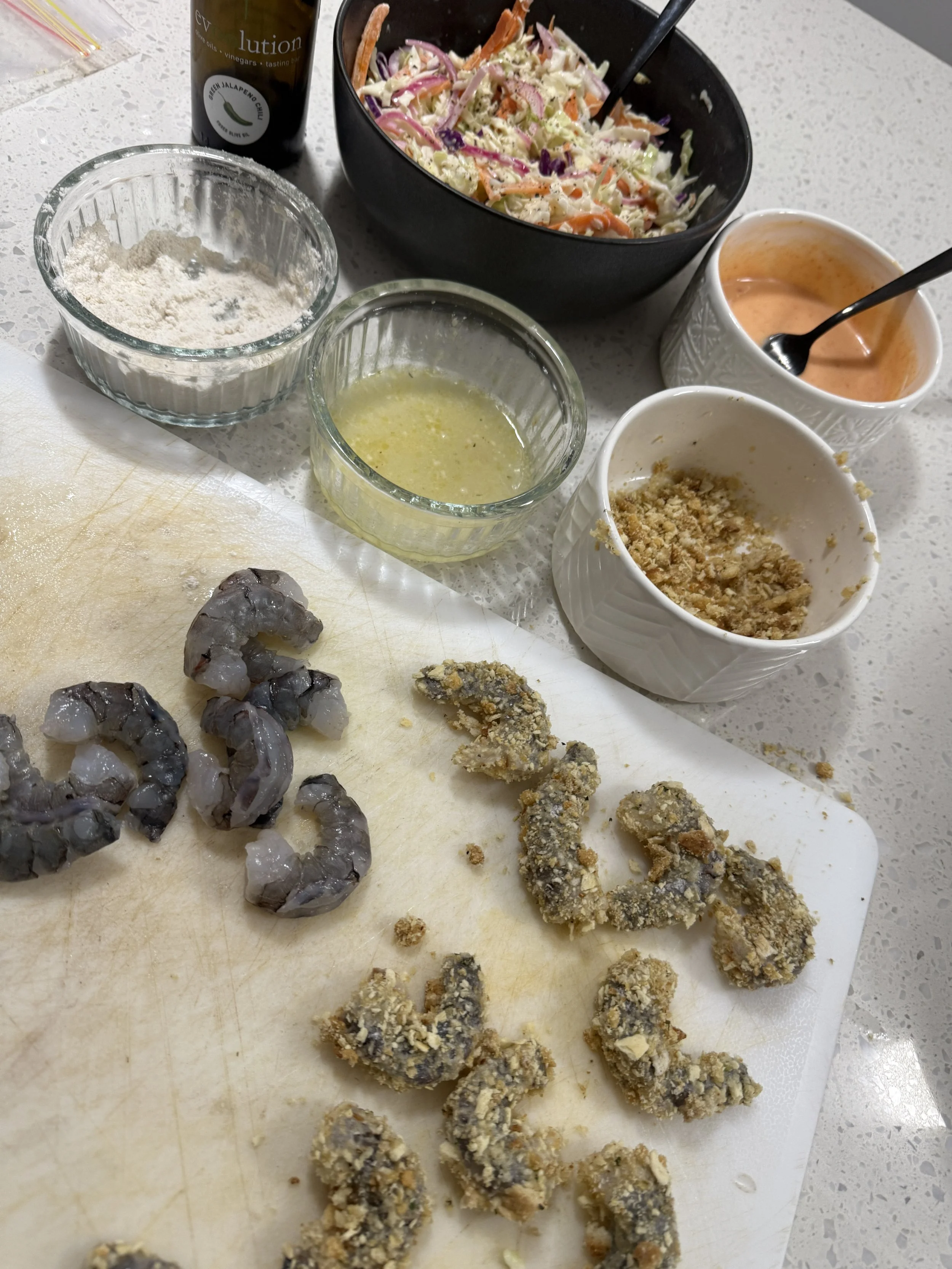Dredge each shrimp, one at a time in the flour mixture, then the egg mixture and finally the panko bread crumbs, ensuring they are full covered except the tail. Lay out on a clean plate or board until finished all shrimp. Allow to sit 5 minutes while getting the air fryer ready.