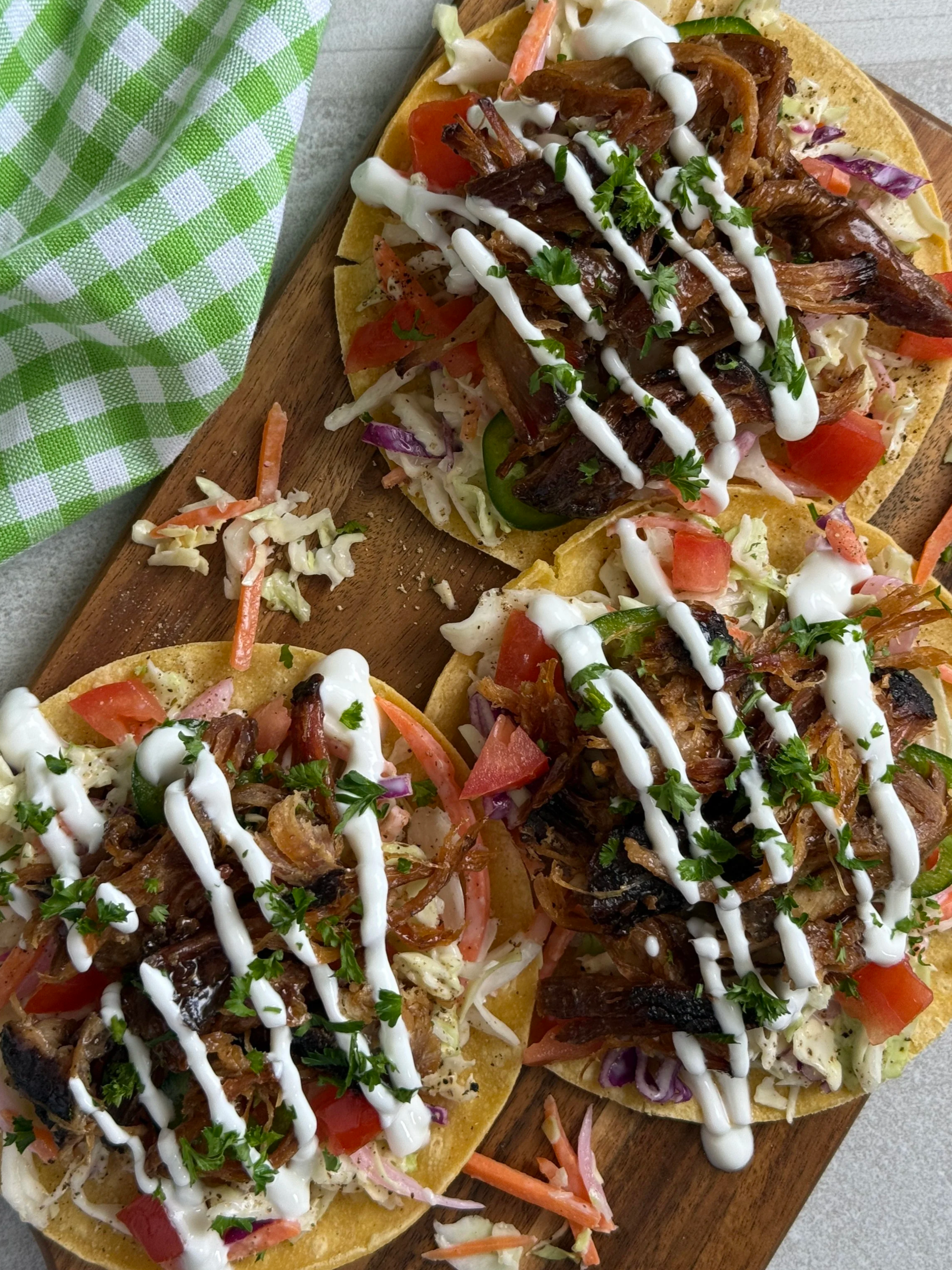 Once the meat has fully cooked, remove from the crock pot, shred using two forks then return the shredded pork to the crock pot to absorb some more of the sauce and allow to sit there on’warm’. Once you are ready with your other ingredients, you can start to build your tacos. Start with the tortilla, layer it with the shredded pork then the 2 different color cabbages and the pickled red onions. Lastly, drizzle with the green crema and away you go!
